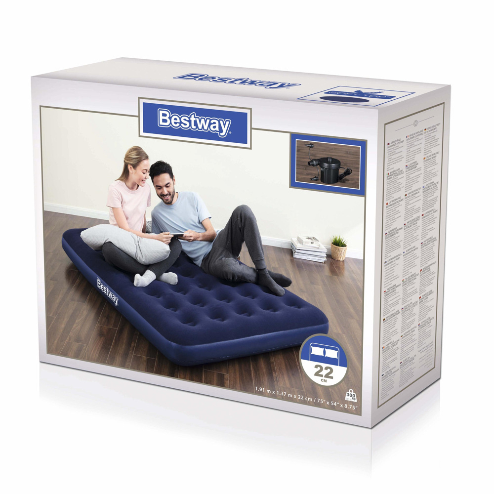 Get a great night’s sleep on the Bestway Double Airbed! Built for comfort and convenience, this air bed inflates in minutes so it’s ready for bed when you are. With features such as a comfortable sleeping surface, sturdy vinyl and coil beam construction, a relaxing and restful night is in the air. The quick inflate/deflate screw valve also allows for easy deflation after use. When you’re done, simply place your flattened Bestway Double Airbed in the included carrying bag for easy transport and storage.