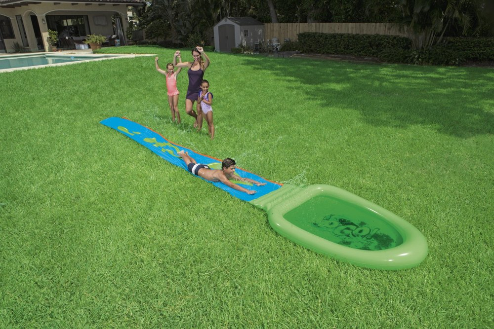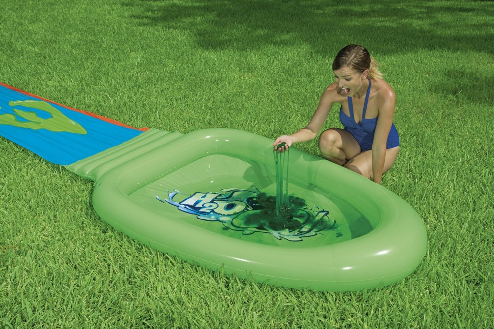The Bestway H2OGO! Slime and Splash Water Slide combines two things that kids love! It’s a single water slide that ends with a giant pool of SLIME! All you have to do is connect a garden hose and dump the included packets of kid-friendly, non-toxic slime into the splash pool. When they’re finished for the day, the pool has a super easy-to-use drain valve. The slime is kid-friendly, non-toxic, washable and eco-friendly. Kids will love gliding straight into a huge pool of green goo!