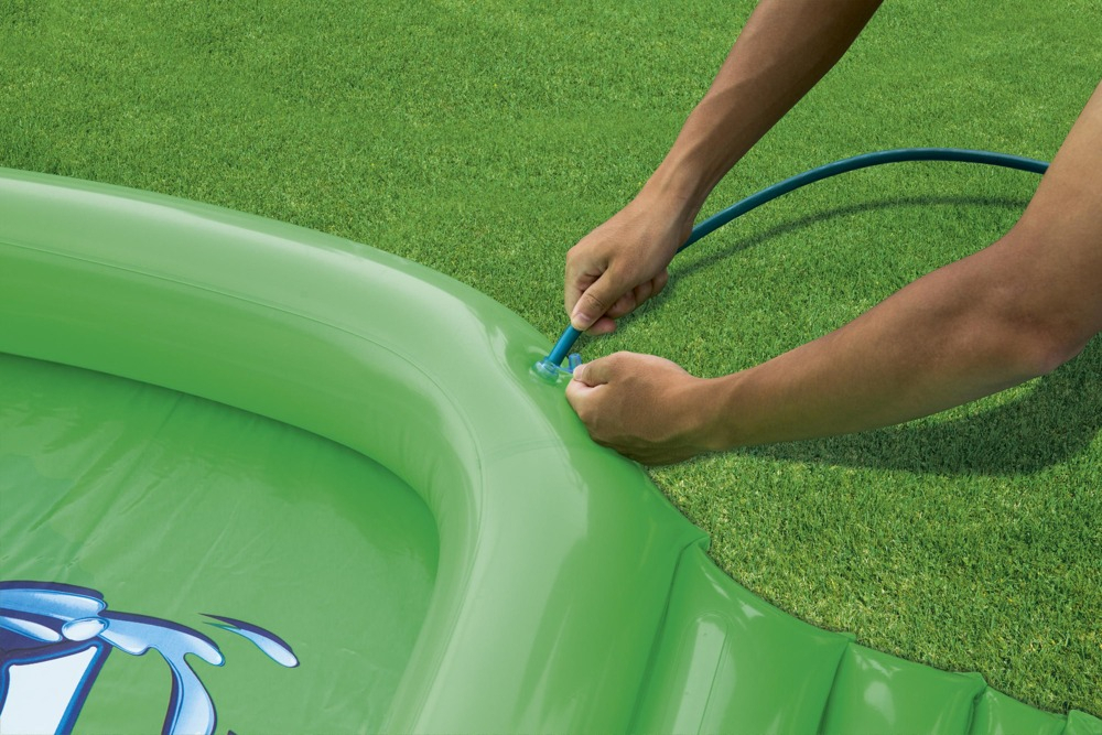 - Simple set-up, just connect a garden hose and dump the slime into the water pool