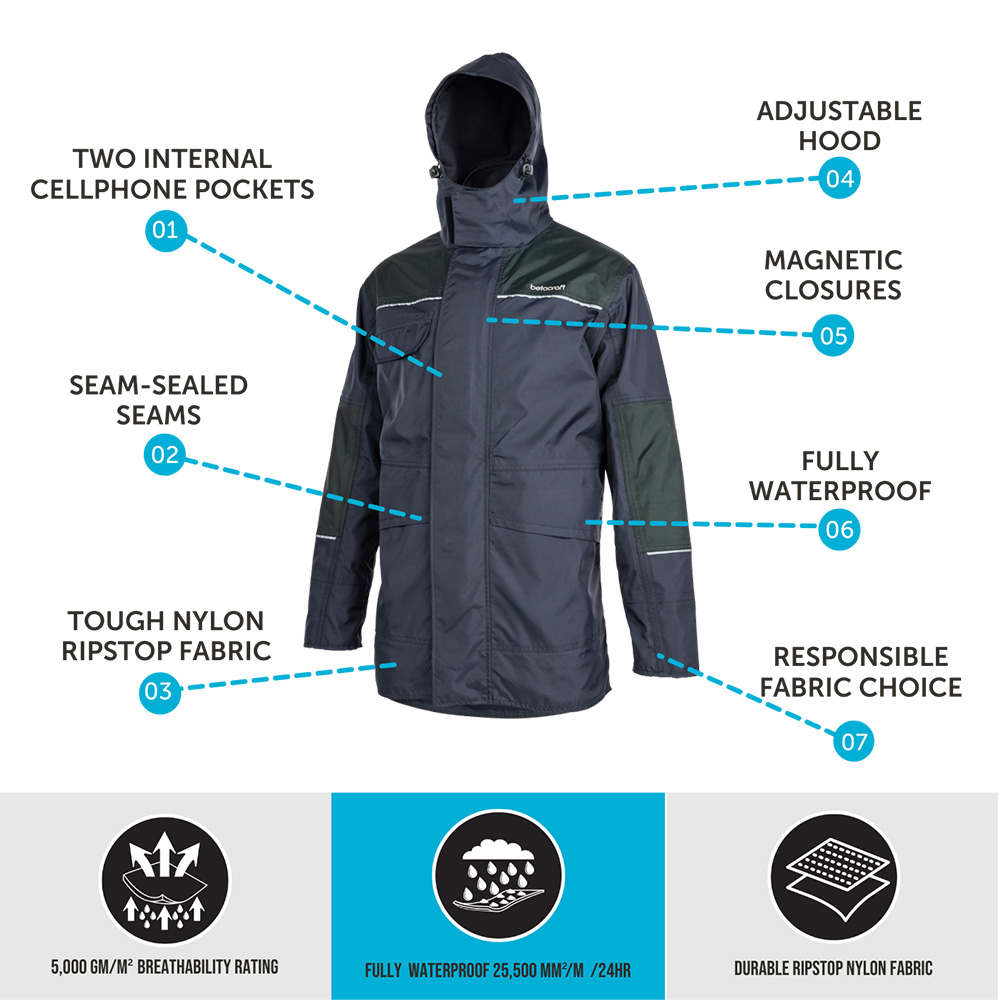 Designed to withstand the rigours of farming life and weekend go-getters, the Betacraft ISO940 Mens Parka is 100% waterproof and breathable. It features tough outer fabric with high denier rating to resist abrasion and rip-stop thread for added protection. To ensure each garment is completely waterproof, an advanced coating is bonded to the outer fabric and seam-seal all seams and stitching. And on the inside, a duo-layer breathable liner.