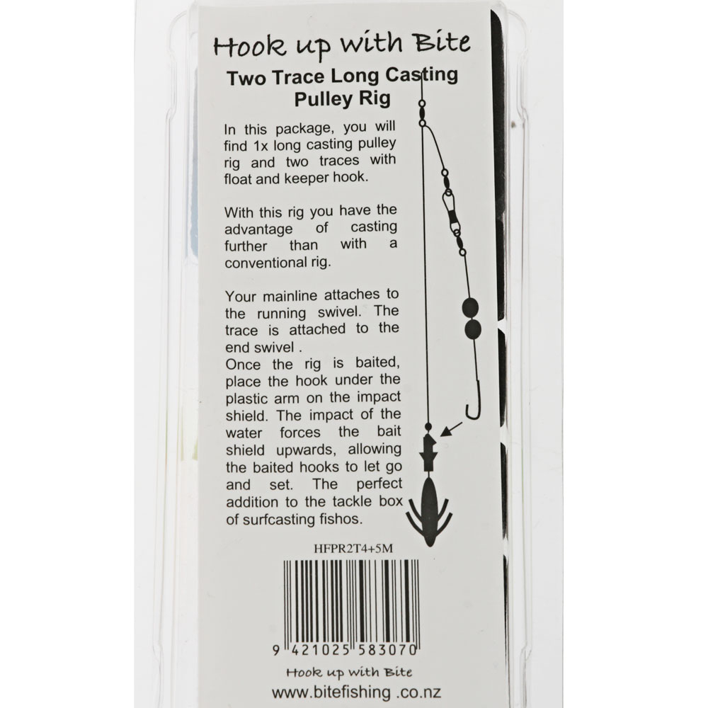 The perfect addition to the tackle box of surfcasting fishos, the Bite Surfcasting Pulley Rig Bullet Float gives you the advantage of casting further than with a conventional rig. Your mainline attaches to the running swivel. The trace is attached to the end swivel. Once the rig is baited, place the hook under the plastic arm on the impact shield. The impact of the water forces the bait shield upwards, allowing the baited hooks to let go and set. This rig comes with bullet floats that help in casting your line further.